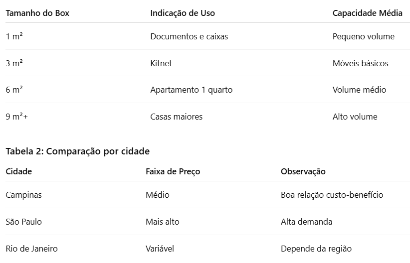 Uma forma prática de calcular é considerar a quantidade de móveis ou caixas que serão armazenadas. Por exemplo, um pequeno apartamento costuma caber em boxes entre 4 m² e 6 m², dependendo da organização.